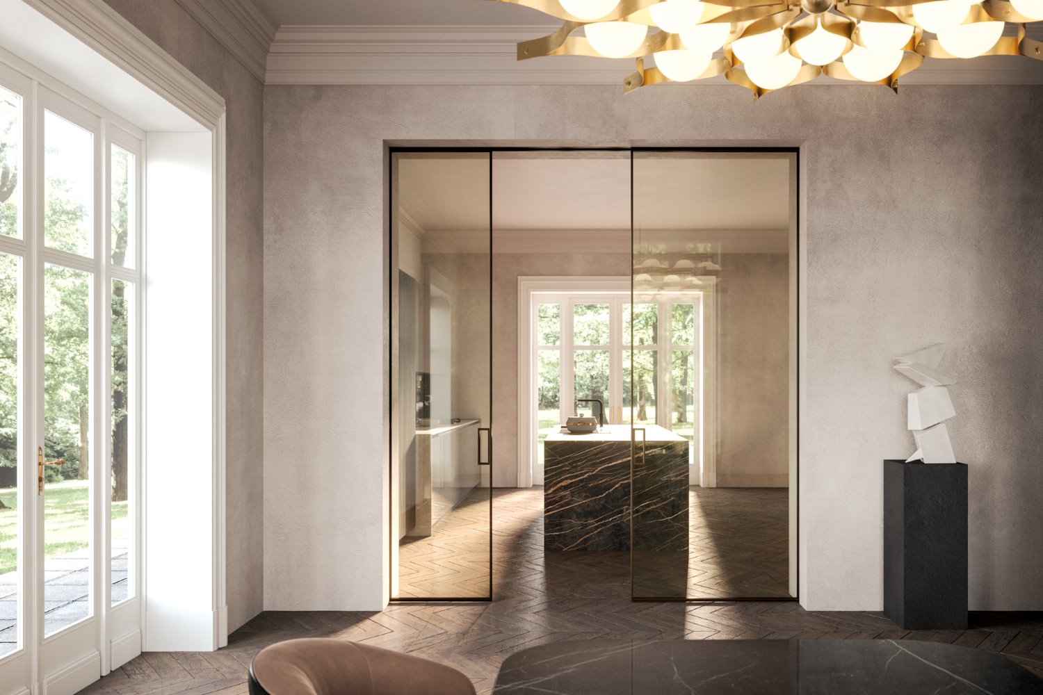 The HenryGlass Sliding Door System offers the perfect balance between functionality and design to revamp your interior spaces. The sliding doors come in two different materials based on the requirements of each single room, the effect you want to obtain or the design aesthetic of the home, office or contract space.